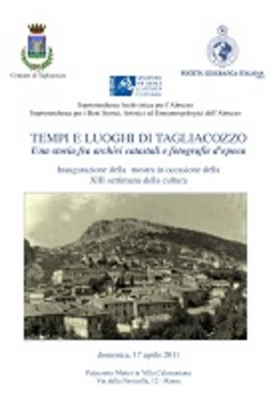 In occasione della XIII settimana della cultura, la Società Geografica Italiana intende proporre, principalmente al pubblico romano - ed in modo particolare alla vasta popolazione di origine abruzzese che abita la Capitale - ma non solo, una mostra in due sezioni che verrà inaugurate presso la sede del Sodalizio, la quale, attraverso un percorso virtuale fra documenti di archivio e fotografie d'epoca, condurrà il visitatore alla scoperta di Tagliacozzo, centro storico minore dell'Abruzzo "romano" e luogo di turismo culturale. La sezione sui catasti storici di Tagliacozzo è la riproposizione, a Roma, della mostra dal titolo Un documento tante storie. I catasti antichi di Tagliacozzo raccontano inaugurata lo scorso 29 luglio nella città abruzzese e frutto della collaborazione della Soprintendenza Archivistica per l'Abruzzo, della Soprintendenza per i Beni Storici Artistici ed Etnoantropologici dell'Abruzzo e della Società Geografica Italiana. La sezione di fotografie storiche, che coprono un ampio arco cronologico compreso all'incirca fra gli anni Venti e gli anni Ottanta del Novecento, è stata realizzata appositamente per l'occasione. Questa propone alcuni significativi scatti che aiutano il visitatore a ripercorrere, attraverso il documento fotografico, la storia della città. Il filo rosso che collega le due sezioni è rappresentato proprio dalla storia del centro abruzzese, la quale può essere indagata e ricostruita anche attraverso documenti tanto diversi per genesi e per finalità, quanto complementari per informazioni che possono fornire